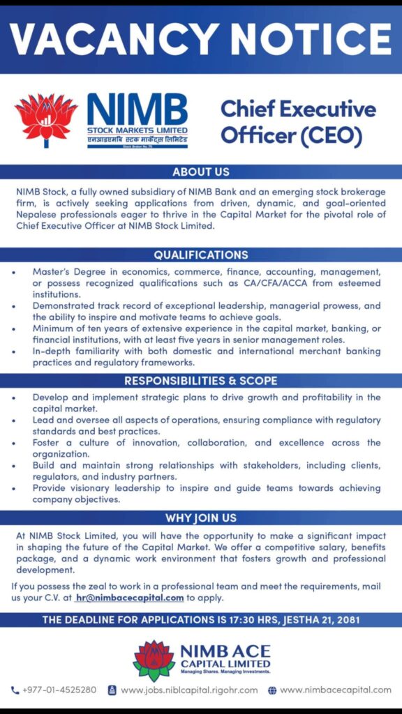 To apply send your C.V at hr@nimbacecapital.com